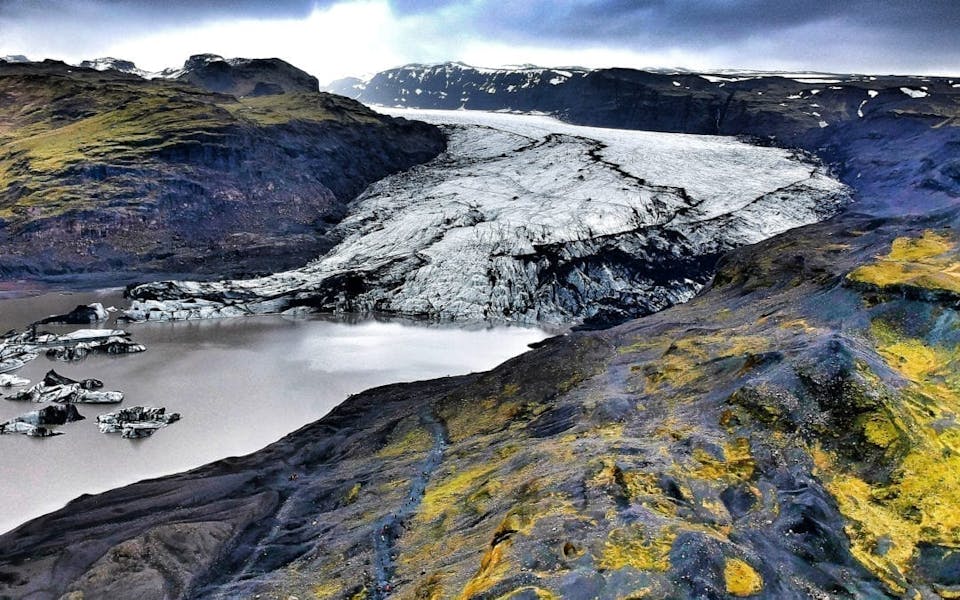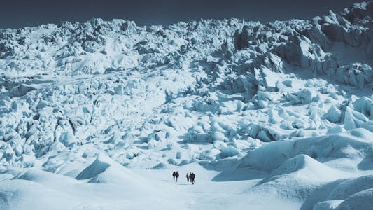 After a short ride on the "Tröll Bus," you will walk a short distance to the edge of the glacier. Your guide will demonstrate how to use the equipment and how to safely walk on the ice. During the walk, you'll observe how the receding ice has shaped the surrounding landscape, noting visible marks on the bedrock and a lagoon formed by meltwater.